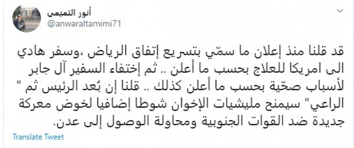 وقال في تغريدة عبر "تويتر" رصدها "المشهد العربي": "قد قلنا منذ إعلان ما سمّي بتسريع اتفاق الرياض، وسفر هادي إلى أمريكا للعلاج بحسب ما أعلن.. ثم إختفاء السفير آل جابر لأسباب صحّية بحسب ما أعلن كذلك".