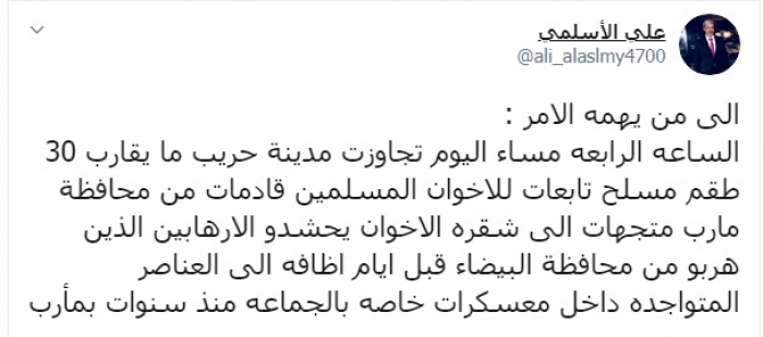 وكتب عبر تغريدة له على "تويتر" رصدها "المشهد العربي": "إلى من يهمه الأمر، الساعة الرابعة مساء اليوم تجاوز مدينة حريب ما يقارب 30 طقم مسلح تابع للإخوان المسلمين قادم من محافظة مأرب متجه إلى شقرة، الإخوان يحشدون الإرهابيين الذين هربوا من محافظة البيضاء قبل أيام إضافة إلى العناصر المتواجدة داخل معسكرات خاصة بالجماعة منذ سنوات بمأرب".