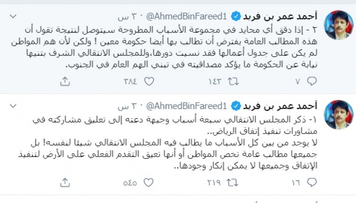 وكتب عبر تغريدة له على "تويتر" رصدها "المشهد العربي": "ذكر المجلس الانتقالي سبعة أسباب وجيهة دعته إلى تعليق مشاركته في مشاورات تنفيذ اتفاق الرياض، لا يوجد من بين كل الأسباب ما يطلب فيه المجلس الانتقالي شيئا لنفسه! بل جميعها مطالب عامة تخص المواطن أو أنها تعيق التقدم الفعلي على الأرض لتنفيذ الاتفاق وجميعها لا يمكن إنكار وجودها".