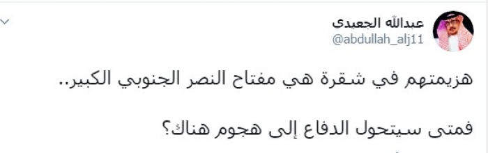 وكتب عبر تغريدة له على "تويتر" رصدها "المشهد العربي": "هزيمتهم في شقرة هي مفتاح النصر الجنوبي الكبير، فمتى سيتحول الدفاع إلى هجوم هناك؟".