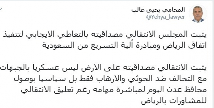 وكتب عبر تغريدة له على "تويتر" رصدها " المشهد العربي": "يثبت المجلس الانتقالي مصداقيته بالتعاطي الإيجابي لتنفيذ اتفاق الرياض ومبادرة آلية التسريع من السعودية، يثبت الانتقالي مصداقيته على الأرض ليس عسكريًا بالجبهات مع التحالف ضد الحوثي والإرهاب فقط بل سياسيًا بوصول محافظ عدن اليوم لمباشرة مهامه رغم تعليق الانتقالي للمشاورات بالرياض".