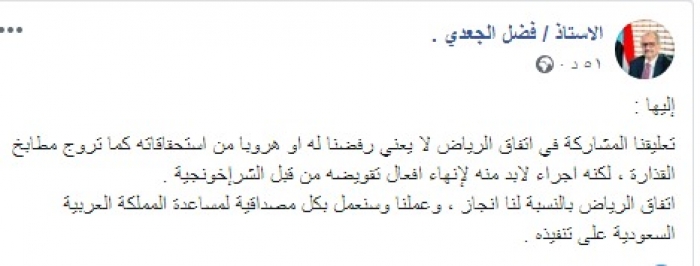 وكتب عبر تغريدة له على "تويتر" رصدها " المشهد العربي": "تعليقنا المشاركة في اتفاق الرياض لا يعني رفضنا له أو هروبًا من استحقاقاته كما تروج مطابخ القذارة، لكنه إجراء لابد منه لإنهاء أفعال تقويضه من قبل الشرإخونجية، اتفاق الرياض بالنسبة لنا إنجاز، وعملنا وسنعمل بكل مصداقية لمساعدة المملكة العربية السعودية على تنفيذه".