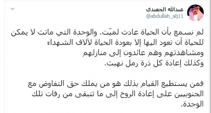 وكتب عبر تغريدة له على "تويتر" رصدها " المشهد العربي": "لم نسمع بأن الحياة عادت لميّت، والوحدة التي ماتت لا يمكن للحياة أن تعود إليها إلا بعودة الحياة لآلاف الشهداء ومشاهدتهم وهم عائدون إلى منازلهم وكذلك إعادة كل ذرة رمل نهبت، فمن يستطيع القيام بذلك هو من يملك حق التفاوض مع الجنوبيين على إعادة الروح إلى ما تتبقى من رفات تلك الوحدة".