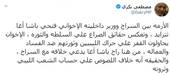 وكتب عبر تغريدة له عل "تويتر" رصدها " المشهد العربي": "الأزمة بين السراج ووزير داخليته الإخواني فتحي باشا أغا تتزايد، وتعكس حقائق الصراع على السلطة والثورة، الإخوان يحاولون القفز على حراك الليبيين وثورتهم ضد الفساد والعمالة، من هنا راح باشا أغا يدعي خلافه مع السراج، والحقيقة أنه خلاف اللصوص على حساب الشعب الليبي وثروته".
