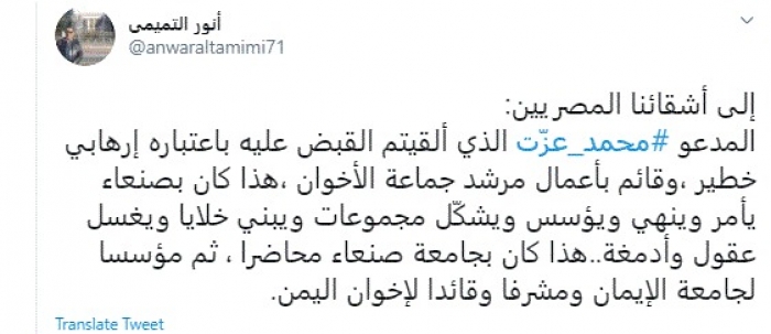 وقال في تغريدة عبر "تويتر" رصدها "المشهد العربي": "إلى أشقائنا المصريين: المدعو محمود عزّت الذي ألقيتم القبض عليه باعتباره إرهابي خطير، وقائم بأعمال مرشد جماعة الإخوان".