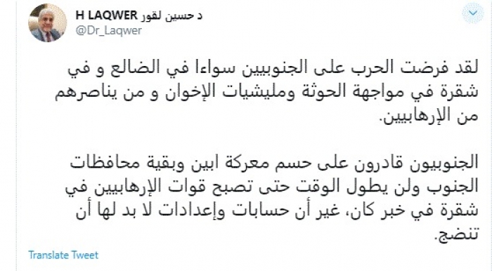 وكتب في تغريدة عبر "تويتر" رصدها "المشهد العربي": "لقد فرضت الحرب على الجنوبيين سواء في الضالع وفي شقرة في مواجهة الحوثة ومليشيات الإخوان ومن يناصرهم من الإرهابيين".