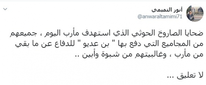 وكتب عبر تغريدة له على "تويتر" رصدها "المشهد العربي": "ضحايا الصاروخ الحوثي الذي استهدف مأرب اليوم ، جميعهم من المجاميع التي دفع بها "بن عديو" للدفاع عن ما بقي من مأرب، وغالبيتهم من شبوة وأبين، لا تعليق".