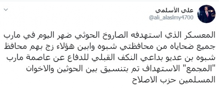وكتب عبر تغريدة له على "تويتر" رصدها "المشهد العربي": "المعسكر الذي استهدفه الصاروخ الحوثي ظهر اليوم في مأرب جميع ضحاياه من محافظتي شبوة وأبين هؤلاء زج بهم محافظ شبوة بن عديو بداعي النكف القبلي للدفاع عن عاصمة مأرب "المجمع" الاستهداف تم بتنسيق بين الحوثيين والإخوان المسلمين حزب الإصلاح".