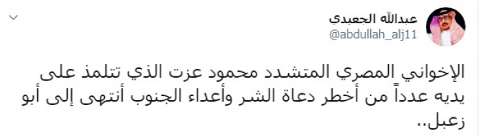 وكتب عبر تغريدة له على "تويتر" رصدها "المشهد العربي": "الإخواني المصري المتشدد محمود عزت الذي تتلمذ على يديه عدد من أخطر دعاة الشر وأعداء الجنوب انتهى إلى أبو زعبل".