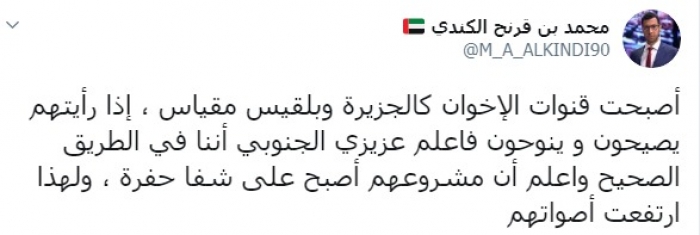 وكتب عبر تغريدة له على "تويتر" رصدها "المشهد العربي": "أصبحت قنوات الإخوان كالجزيرة وبلقيس مقياسا، إذا رأيتهم يصيحون وينوحون فاعلم عزيزي الجنوبي أننا في الطريق الصحيح واعلم أن مشروعهم أصبح على شفا حفرة، ولهذا ارتفعت أصواتهم".