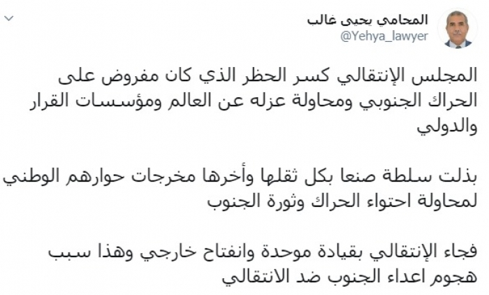وكتب عبر تغريدة له على "تويتر" رصدها "المشهد العربي": "المجلس الانتقالي كسر الحظر الذي كان مفروضا على الحراك الجنوبي ومحاولة عزله عن العالم ومؤسسات القرار الدولي، بذلت سلطة صنعاء بكل ثقلها وآخرها مخرجات حوارهم الوطني لمحاولة احتواء الحراك وثورة الجنوب، فجاء الانتقالي بقيادة موحدة وانفتاح خارجي وهذا سبب هجوم أعداء الجنوب ضد الانتقالي".