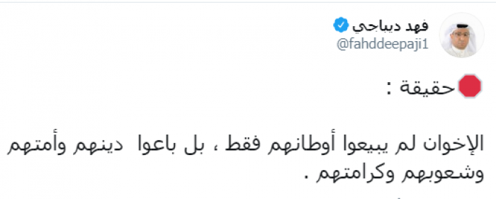 وكتب عبر تغريدة له على "تويتر" رصدها " المشهد العربي": " حقيقة، الإخوان لم يبيعوا أوطانهم فقط ، بل باعوا دينهم وأمتهم وشعوبهم وكرامتهم".