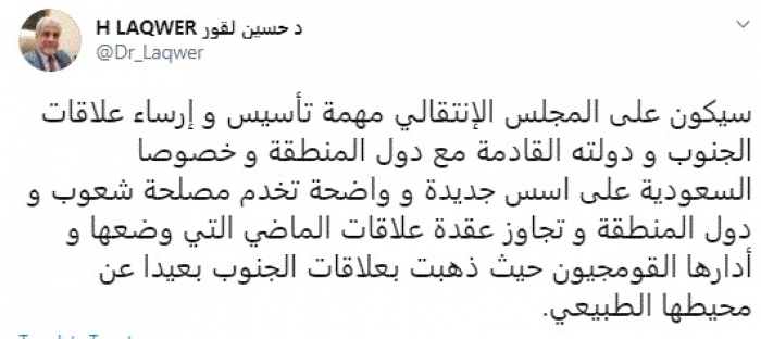 وقال في تغريدة عبر "تويتر" رصدها "المشهد العربي": "سيكون على المجلس الانتقالي مهمة تأسيس وإرساء علاقات الجنوب ودولته القادمة مع دول المنطقة وخصوصًا السعودية على أسس جديدة وواضحة تخدم مصلحة شعوب ودول المنطقة".