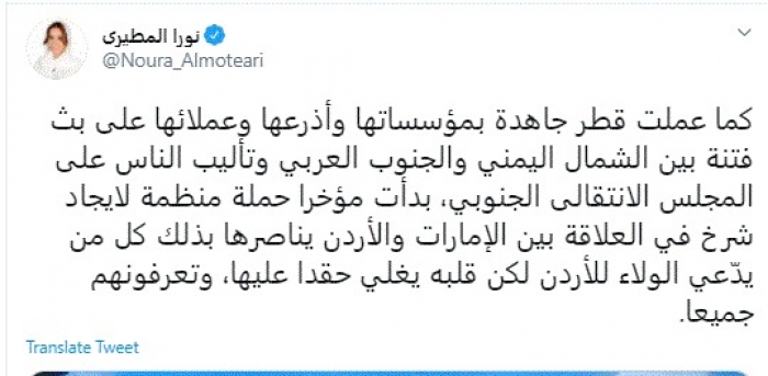 وقالت في تغريدة عبر "تويتر" رصدها "المشهد العربي": "كما عملت قطر جاهدة بمؤسساتها وأذرعها وعملائها على بث فتنة بين اليمن والجنوب العربي وتأليب الناس على المجلس الانتقالي الجنوبي".