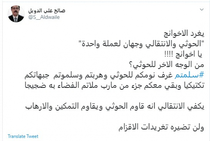 وقال في تغريدة عبر "تويتر" رصدها "المشهد العربي": "يغرد الإخوانج، الحوثي والانتقالي وجهان لعملة واحدة".