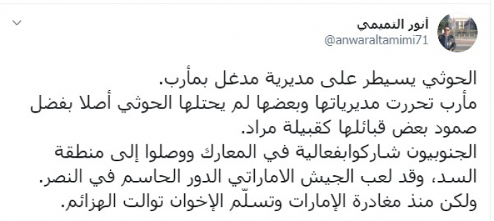 وكتب عبر تغريدة له على "تويتر" رصدها "المشهد العربي": "الحوثي يسيطر على مديرية مدغل بمأرب، مأرب تحررت مديرياتها وبعضها لم يحتلها الحوثي أصلا بفضل صمود بعض قبائلها كقبيلة مراد، الجنوبيون شاركوا بفعالية في المعارك ووصلوا إلى منطقة السد، وقد لعب الجيش الإماراتي الدور الحاسم في النصر، ولكن منذ مغادرة الإمارات وتسلّم الإخوان توالت الهزائم".