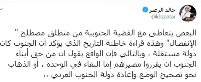 أكد المحلل السياسي السعودي خالد الزعتر، اليوم الأحد، أنه من حق الجنوب تقرير مصيره.