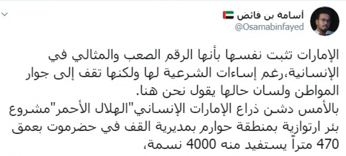 وكتب عبر تغريدات له على "تويتر" رصدها "المشهد العربي": "الإمارات تثبت نفسها بأنها الرقم الصعب والمثالي في الإنسانية، رغم إساءات الشرعية لها ولكنها تقف إلى جوار المواطن ولسان حالها يقول نحن هنا، بالأمس دشن ذراع الإمارات الإنساني "الهلال الأحمر" مشروع بئر ارتوازية بمنطقة حوارم بمديرية القف في حضرموت بعمق 470 مترا يستفيد منها 4000 نسمة، كمبادرة لمحاربة العطش وتوفير مصادر المياه في صحراء حضرموت التي تعاني من شح المياه".