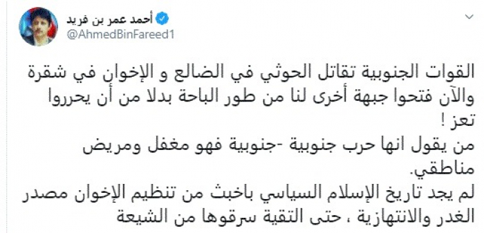 وقال في تغريدة عبر "تويتر" رصدها "المشهد العربي": "القوات الجنوبية تقاتل الحوثي في الضالع والإخوان في شقرة والآن فتحوا جبهة أخرى لنا من طور الباحة بدلًا من أن يحرروا تعز".