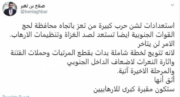 وقال في تغريدة عبر "تويتر" رصدها "المشهد العربي": "استعدادات لشن حرب كبيرة من تعز باتجاه محافظة لحج القوات الجنوبية أيضًا تستعد لصد الغزاة وتنظيمات الإرهاب".