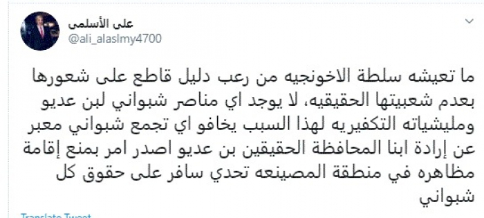 وأوضح: "بن عديو أصدر أمر بمنع إقامة مظاهرة في منطقة المصينعة، تحدي سافر على حقوق كل شبواني".