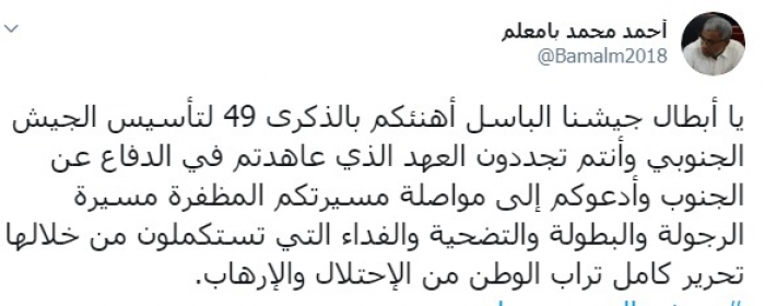 وكتب عبر تغريدة له على "تويتر" رصدها "المشهد العربي": "يا أبطال جيشنا الباسل أهنئكم بالذكرى 49 لتأسيس الجيش الجنوبي، وأنتم تجددون العهد الذي عاهدتم في الدفاع عن الجنوب وأدعوكم إلى مواصلة مسيرتكم المظفرة مسيرة الرجولة والبطولة والتضحية والفداء التي تستكملون من خلالها تحرير كامل تراب الوطن من الاحتلال والإرهاب".