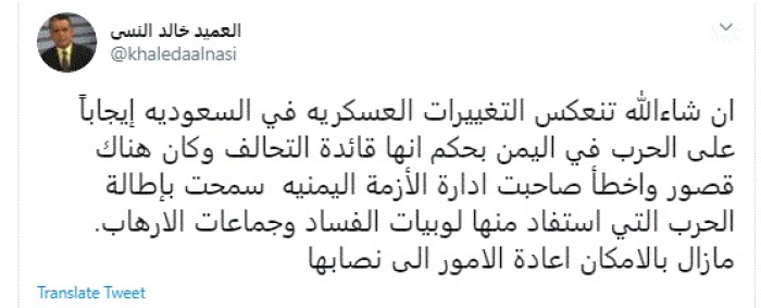 النسي: التغييرات العسكرية بالسعودية ستنعكس بالإيجاب على الحرب في اليمن