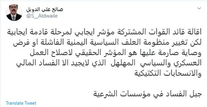 وقال في تغريدة عبر "تويتر" رصدها "المشهد العربي": "إقالة قائد القوات المشتركة مؤشر إيجابي لمرحلة قادمة إيجابية لكن تغيير منظومة العلف السياسية اليمنية الفاشلة أو فرض وصاية صارمة عليها هو المؤشر الحقيقي لإصلاح العمل العسكري والسياسي المهلهل الذي لا يجيد إلا الفساد المالي والانسحابات التكتيكية".