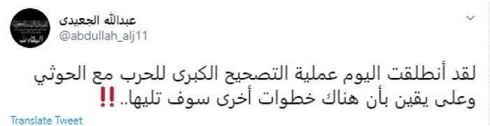 وكتب في تغريدة عبر "تويتر" رصدها "المشهد العربي": "لقد انطلقت اليوم عملية التصحيح الكبرى للحرب مع الحوثي وعلى يقين بأن هناك خطوات أخرى سوف تليها".