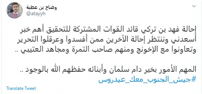 وقال في تغريدة عبر "تويتر" رصدها "المشهد العربي": "إحالة فهد بن تركي قائد القوات المشتركة للتحقيق أهم خبر أسعدني وننتظر إحالة الآخرين ممن أفسدوا وعرقلوا التحرير وتعاونوا مع الإخونج ومنهم صاحب التمرة ومجاهد العتيبي".