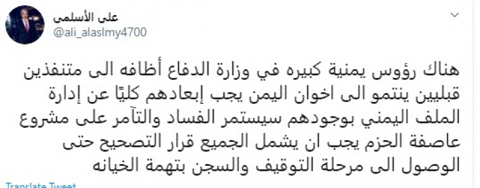 طالب الناشط السياسي علي الأسلمي، اليوم، بإبعاد الرؤوس الكبيرة بوزارة الدفاع اليمنية بالإضافة لقيادات إخوانية عن إدارة الملف اليمني بعد القرارات العسكرية الأخيرة بالسعودية.