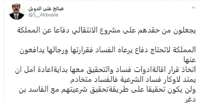 وأضاف: "المملكة لاتحتاج دفاع يرعاه الفساد فقرارتها ورجالها يدافعون عنها".
