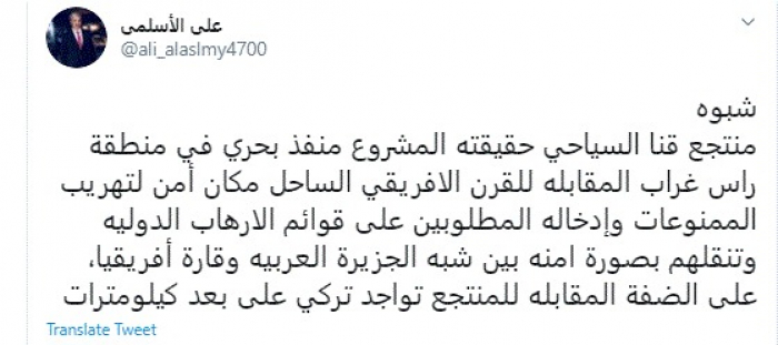 وأضاف: "الساحل مكان أمن لتهريب الممنوعات وإدخاله المطلوبين على قوائم الإرهاب الدولية وتنقلهم بصورة آمنة بين شبه الجزيرة العربية وقارة أفريقيا، على الضفة المقابلة للمنتجع تواجد تركي على بعد كيلومترات".