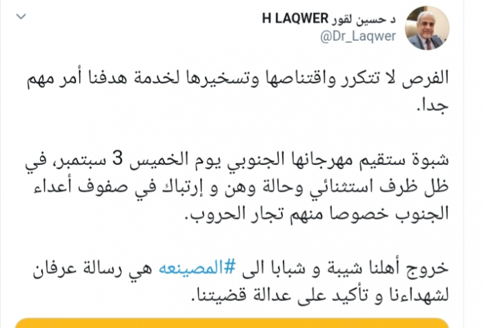 وكتب عبر تغريدة له على "تويتر" رصدها "المشهد العربي": "الفرص لا تتكرر واقتناصها وتسخيرها لخدمة هدفنا أمر مهم جدا، شبوة ستقيم مهرجانها الجنوبي يوم الخميس 3 سبتمبر، في ظل ظرف استثنائي وحالة وهن وارتباك في صفوف أعداء الجنوب خصوصا منهم تجار الحروب، خروج أهلنا شيبة و شبابا إلى المصينعة هي رسالة عرفان لشهدائنا و تأكيد على عدالة قضيتنا".