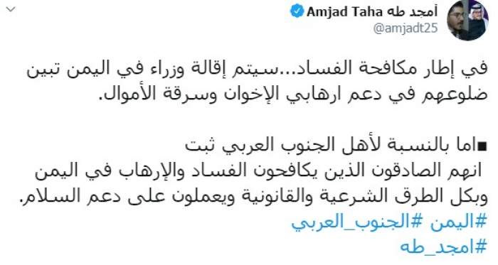 وكتب عبر تغريدة له على "تويتر" رصدها " المشهد العربي": "في إطار مكافحة الفساد، سيتم إقالة وزراء في اليمن تبين ضلوعهم في دعم إرهابيي الإخوان وسرقة الأموال، أما بالنسبة لأهل الجنوب العربي ثبت أنهم الصادقون الذين يكافحون الفساد والإرهاب في اليمن وبكل الطرق الشرعية والقانونية ويعملون على دعم السلام".