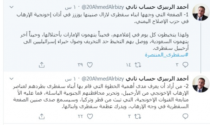 وكتب عبر تغريدة له على "تويتر" رصدها "المشهد العربي": "الصفعة التي وجهها أبناء سقطرى لازال صنينها يوززز في أذان إخونجية الإرهاب في حزب الإصلاح اليمني، ولهذا يتخبطون كل يوم في إعلامهم، فحينا يتهمون الإمارات باحتلالها، وحينا آخر يتهمون السعودية، ووصل بهم التخبط حد التخريف وصول خبراء إسرائيليين الى أرخبيل سقطرى".