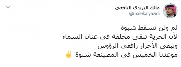 وكتب عبر تغريدة له على "تويتر" رصدها "المشهد العربي": "لم ولن تسقط شبوة، لأن الحرية تبقى محلقة في عنان السماء، ويبقى الأحرار رافعي الرؤوس، موعدنا الخميس في المصينعة شبوة".