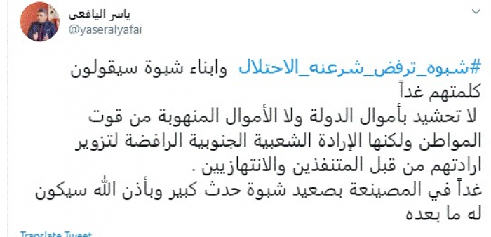 وقال في تغريدة عبر "تويتر" رصدها "المشهد العربي": "شبوة ترفض شرعنة الاحتلال وأبناء شبوة سيقولون كلمتهم غداً".