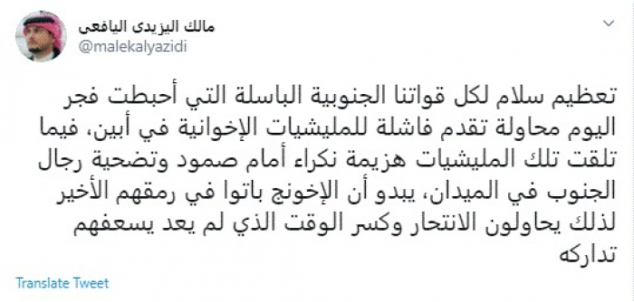 وكتب في تغريدة عبر "تويتر" رصدها "المشهد العربي": "تعظيم سلام لكل قواتنا الجنوبية الباسلة التي أحبطت فجر اليوم محاولة تقدم فاشلة للمليشيات الإخوانية في أبين، فيما تلقت تلك المليشيات هزيمة نكراء أمام صمود وتضحية رجال الجنوب في الميدان".