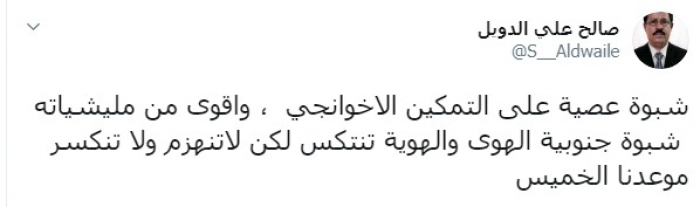 وكتب عبر تغريدة له على "تويتر" رصدها " المشهد العربي": "شبوة عصية على التمكين الإخوانجي ، وأقوى من مليشياته، شبوة جنوبية الهوى والهوية تنتكس لكن لا تنهزم ولا تنكسر، موعدنا الخميس".