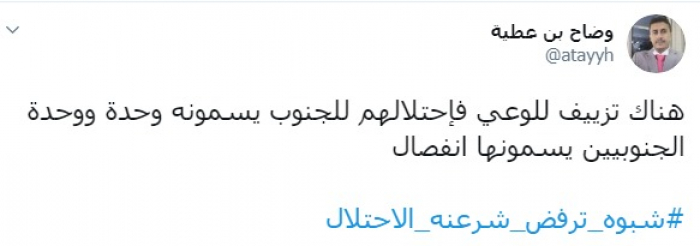 وكتب عبر تغريدة له على "تويتر" رصدها "المشهد العربي": "هناك تزييف للوعي فاحتلالهم للجنوب يسمونه وحدة ووحدة الجنوبيين يسمونها انفصالا".