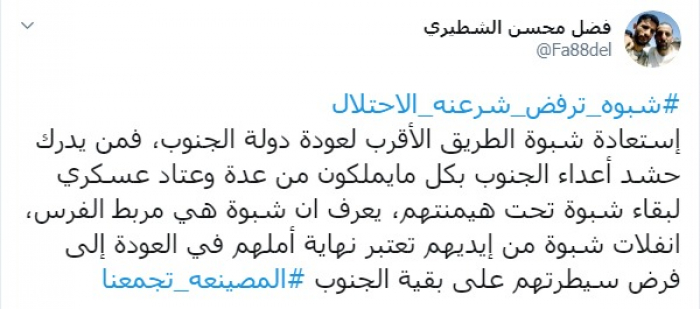 وكتب عبر تغريدة له على "تويتر" رصدها "المشهد العربي": "استعادة شبوة الطريق الأقرب لعودة دولة الجنوب، فمن يدرك حشد أعداء الجنوب بكل ما يملكون من عدة وعتاد عسكري لبقاء شبوة تحت هيمنتهم، يعرف أن شبوة هي مربط الفرس، انفلات شبوة من أيديهم يعتبر نهاية أملهم في العودة إلى فرض سيطرتهم على بقية الجنوب".