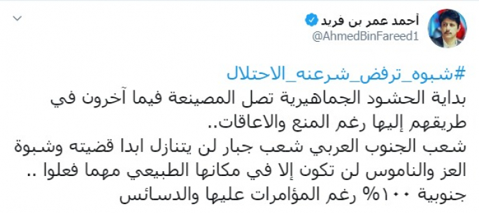 وكتب عبر تغريدة له على "تويتر" رصدها " المشهد العربي": "بداية الحشود الجماهيرية تصل المصينعة فيما آخرون في طريقهم إليها رغم المنع والإعاقات، شعب الجنوب العربي شعب جبار لن يتنازل أبدًا عن قضيته وشبوة العز والناموس لن تكون إلا في مكانها الطبيعي مهما فعلوا، جنوبية 100% رغم المؤامرات عليها والدسائس".