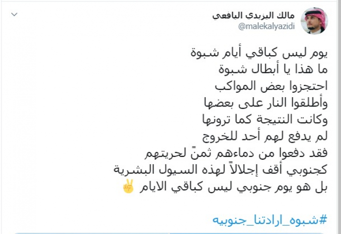 وكتب عبر تغريدة له على "تويتر" رصدها " المشهد العربي": "يوم ليس كباقي أيام شبوة، ما هذا يا أبطال شبوة، احتجزوا بعض المواكب، وأطلقوا النار على بعضها، وكانت النتيجة كما ترونها، لم يدفع لهم أحد للخروج، فقد دفعوا من دماءهم ثمنًا لحريتهم، كجنوبي أقف إجلالًا لهذه السيول البشرية، بل هو يوم جنوبي ليس كباقي الأيام".