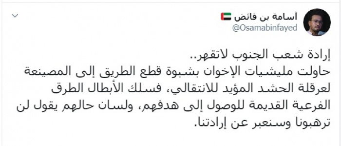 وكتب عبر تغريدة له على "تويتر" رصدها " المشهد العربي": "إرادة شعب الجنوب لا تقهر، حاولت مليشيات الإخوان بشبوة قطع الطريق إلى المصينعة لعرقلة الحشد المؤيد للانتقالي، فسلك الأبطال الطرق الفرعية القديمة للوصول إلى هدفهم، ولسان حالهم يقول لن ترهبونا وسنعبر عن إرادتنا".