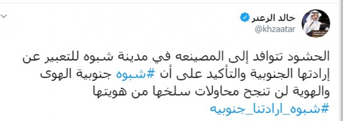 وكتب عبر تغريدة له على "تويتر" رصدها " المشهد العربي": "الحشود تتوافد إلى المصينعة في مدينة شبوة للتعبير عن إرادتها الجنوبية والتأكيد على أن شبوة جنوبية الهوى والهوية، لن تنجح محاولات سلخها من هويتها".