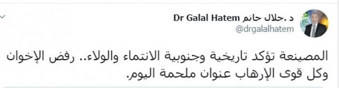 وكتب عبر تغريدة له على "تويتر" رصدها " المشهد العربي": "المصينعة تؤكد تاريخية وجنوبية الانتماء والولاء، رفض الإخوان وكل قوى الإرهاب عنوان ملحمة اليوم".