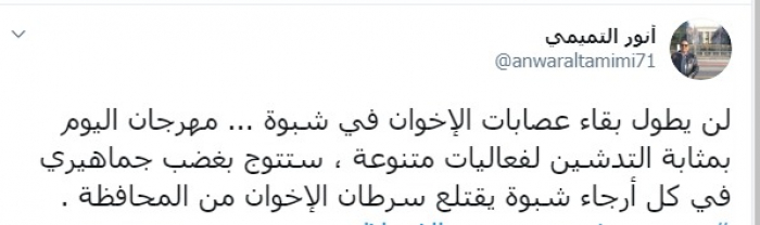 وكتب عبر تغريدة له على "تويتر" رصدها " المشهد العربي": "لن يطول بقاء عصابات الإخوان في شبوة، مهرجان اليوم بمثابة التدشين لفعاليات متنوعة ستتوج بغضب جماهيري في كل أرجاء شبوة يقتلع سرطان الإخوان من المحافظة" .
