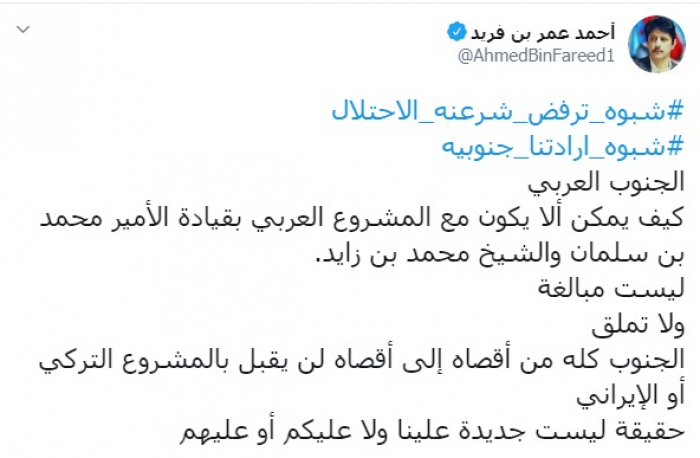 وكتب عبر تغريدة له على "تويتر" رصدها " المشهد العربي": "الجنوب العربي، كيف يمكن ألا يكون مع المشروع العربي بقيادة الأمير محمد بن سلمان والشيخ محمد بن زايد، ليست مبالغة، ولا تملق، الجنوب كله من أقصاه إلى أقصاه لن يقبل بالمشروع التركي أو الإيراني، حقيقة ليست جديدة علينا ولا عليكم أو عليهم".