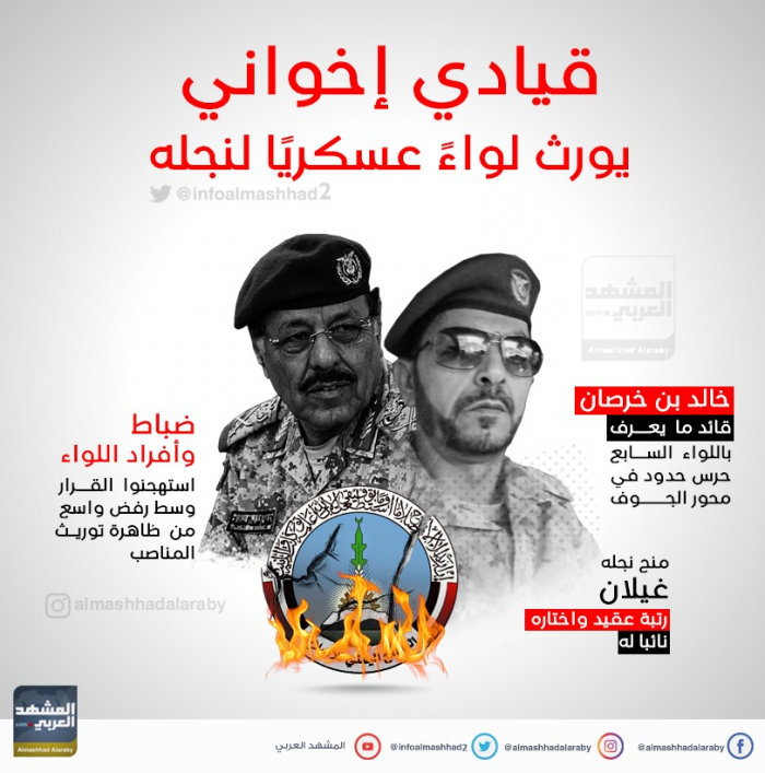 في موقف متكرر بصفوف مليشيا الإخوان الإرهابية، أمر قائد اللواء السابع حرس حدود الخاضع لتنظيم الإخوان الإرهابي، بتعيين نجله نائبا له.